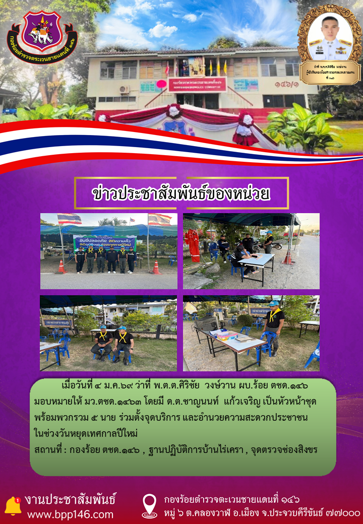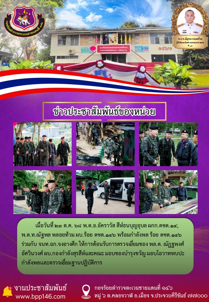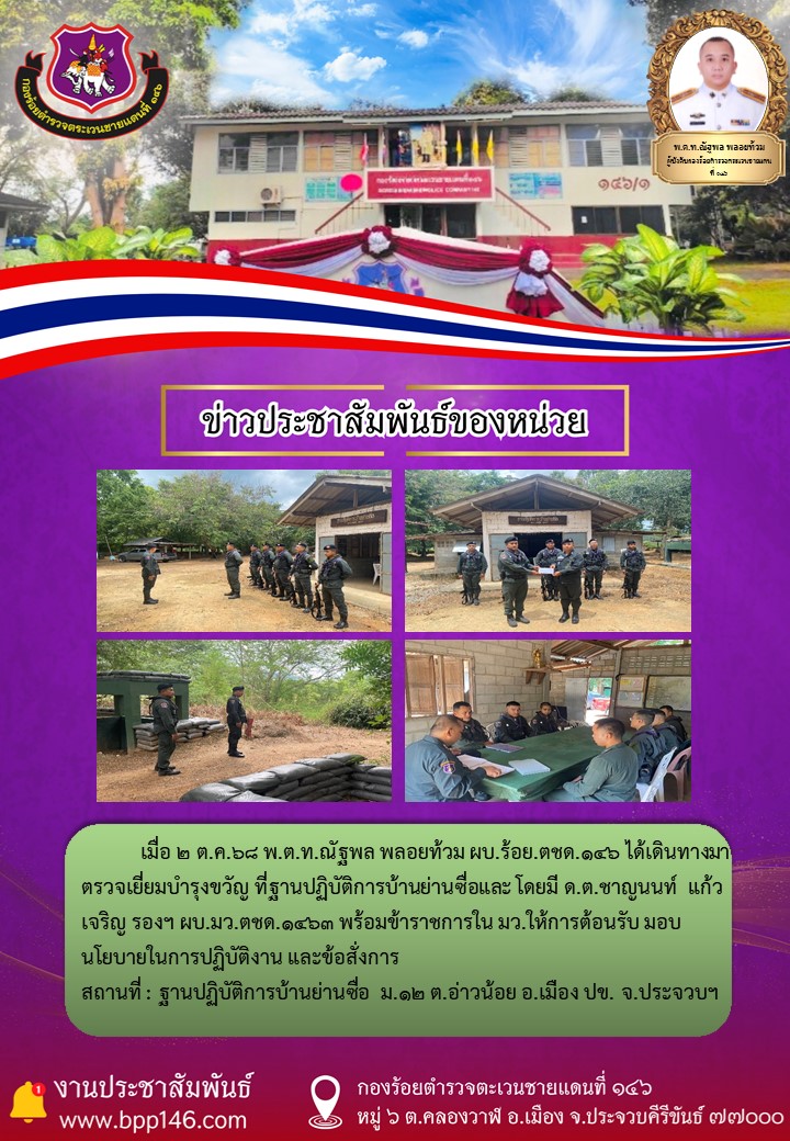 เมื่อวันที่ 1 พ.ค. 67 เวลา 17.00 – 18.20 น. พ.ต.ท.ณัฐพล พลอยท้วม ผล.ร้อย ตชด.146 ได้มอบหมายให้ ร.ต.อ.สุวิพล จันทร์แย้ม รอง สวป.(ป) พร้อมพวกรวม 4 นายและข้าราชการตำรวจจิตอาสา กก.ตชด.14 รวม